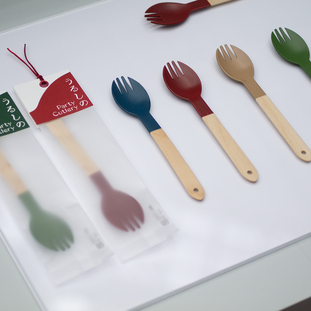 使い捨てのパーティーカトラリーにウレタン塗装を施し、さらに先端には本漆を塗ることで強度を高め、繰り返し使えるパーティーカトラリーに仕立てました。