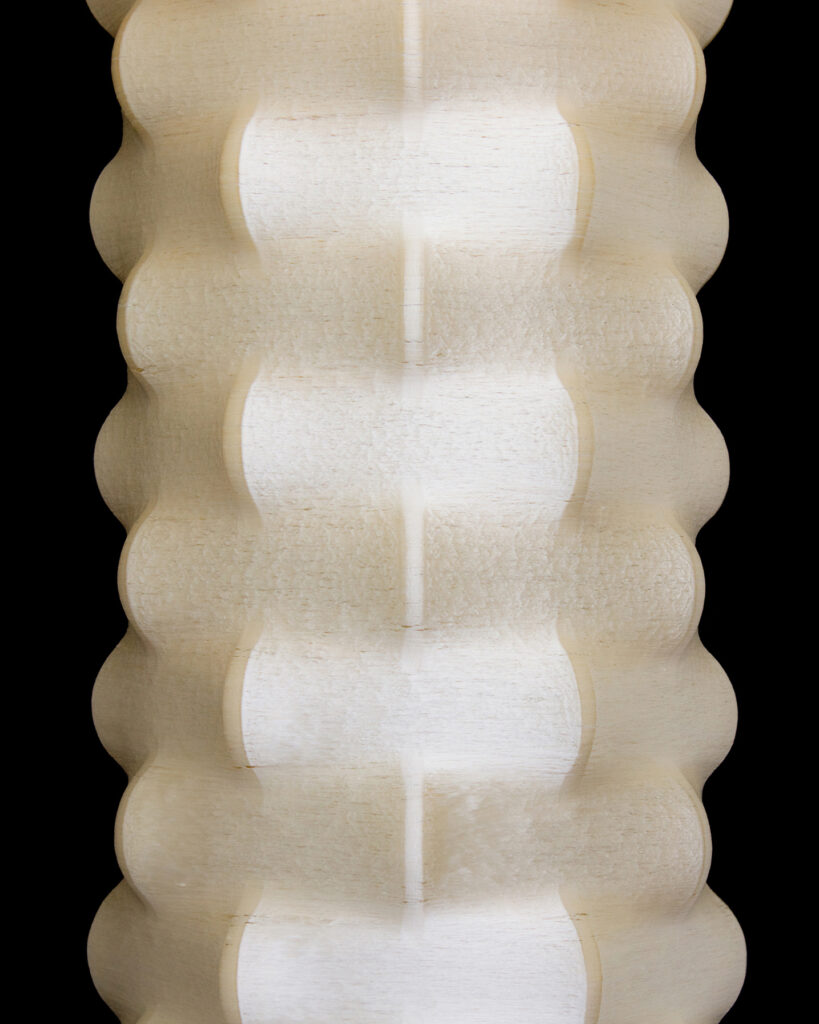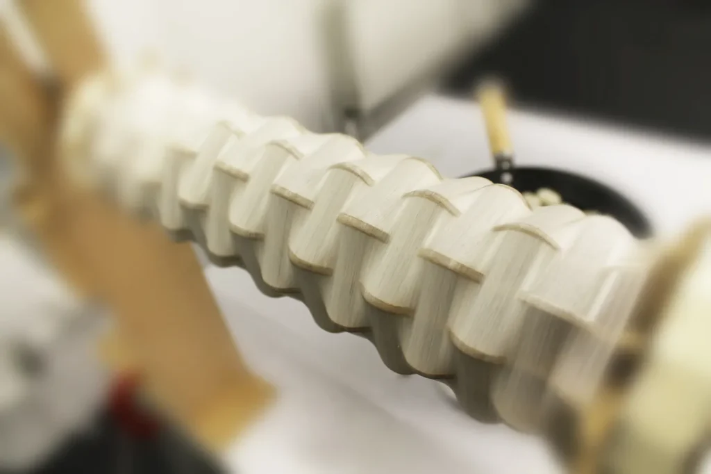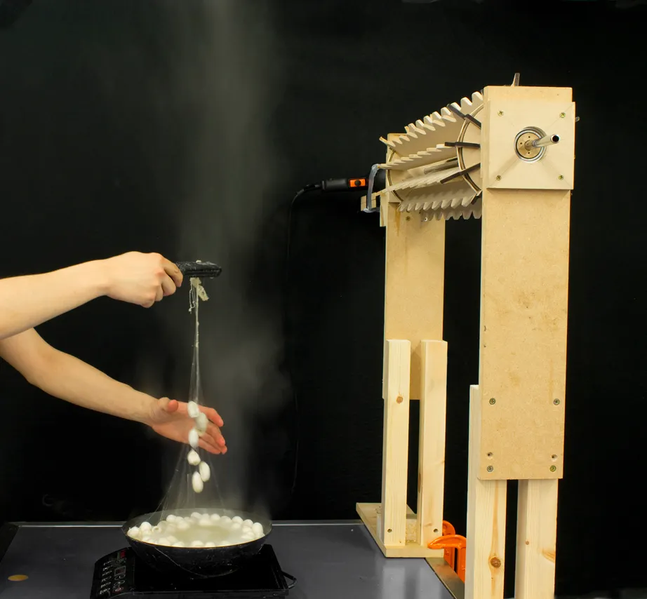 By boiling the cocoons and winding the loosened silk fibers directly onto a mold, the structure is shaped without the need for a rigid frame. The sericin contained in the cocoon acts as a natural binder, allowing the form to retain its shape independently.