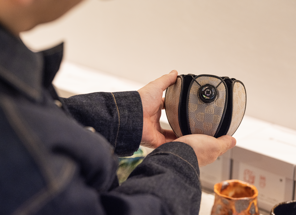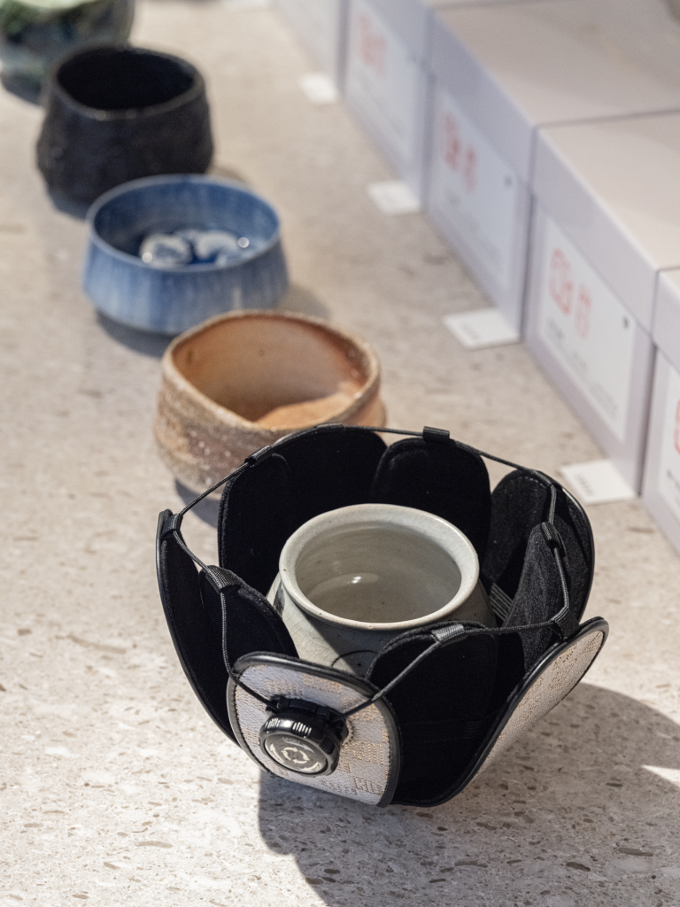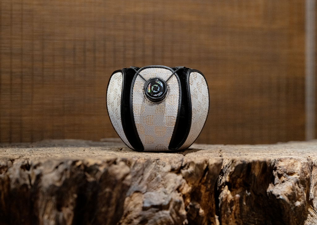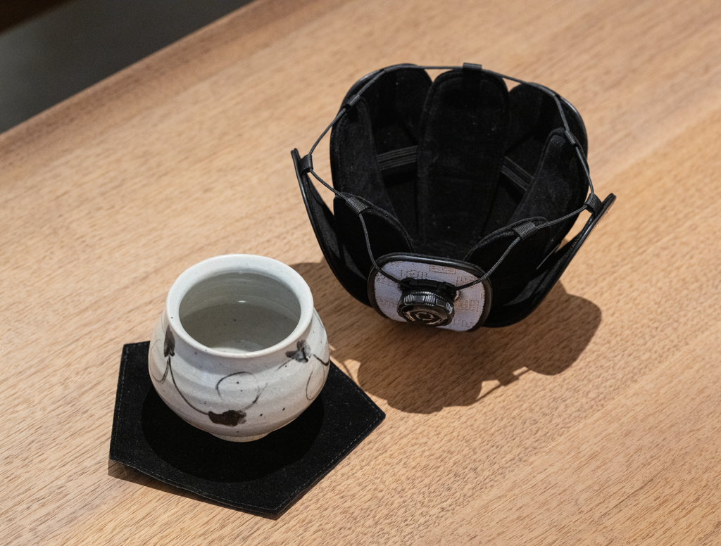 While incorporating design inspiration from shifuku—traditional cloth pouches used for carrying tea utensils—the case itself features a double-layer structure engineered specifically to protect a sakawan. The outer fabric is made of original Saga Nishiki brocade, custom-produced for this product by Nishimura Orimono. The cup is gently enveloped within the case, and a cushioned interior material securely protects it from impact.